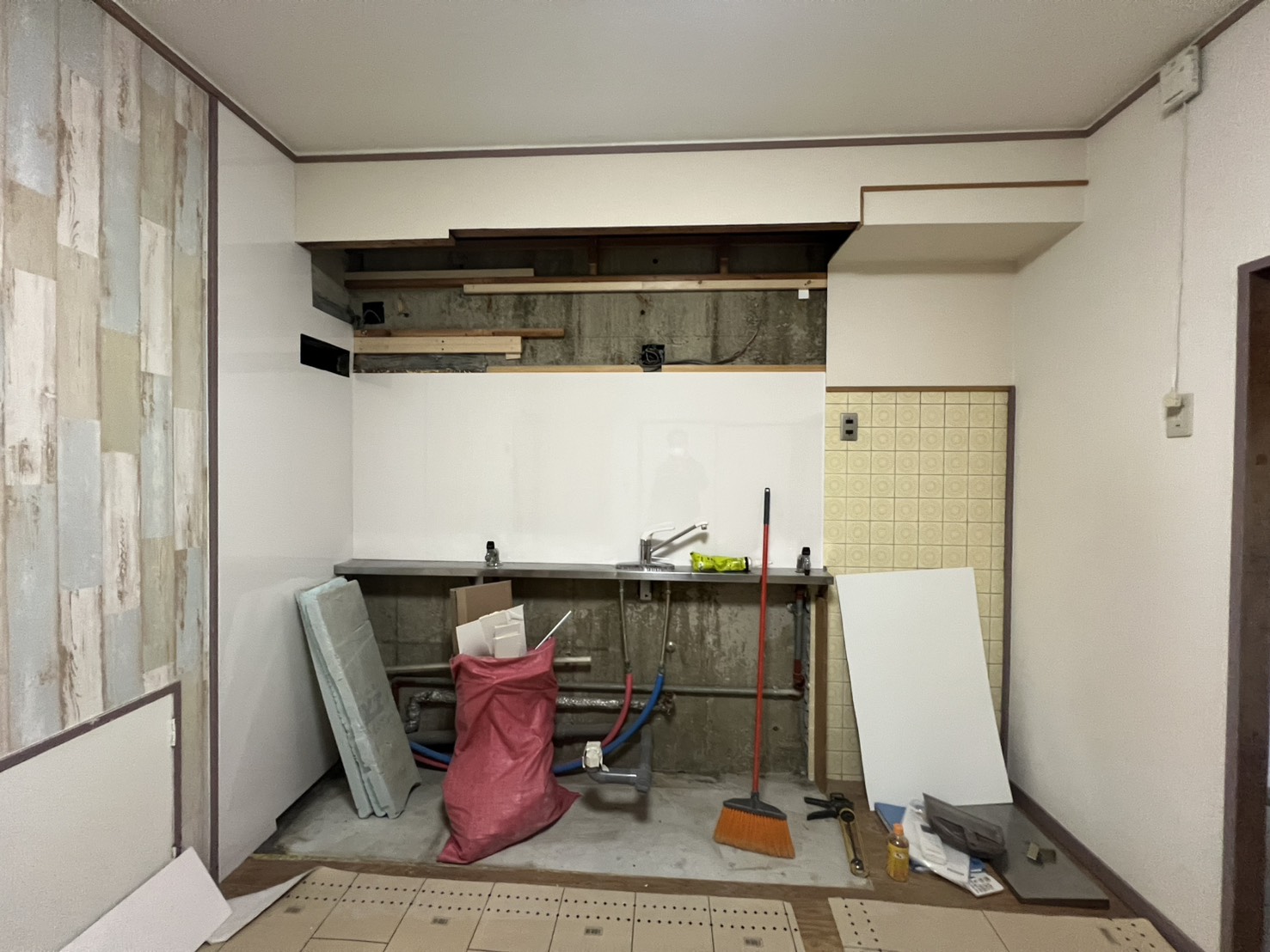 コンパネや石膏ボードもない状態でしたので、キッチンの正面と左面にパネルを施工しました。