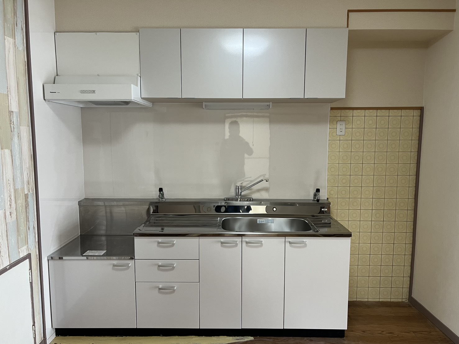 換気扇、吊り戸棚、LED照明、シンクユニット、ガス置き台を取付けました。